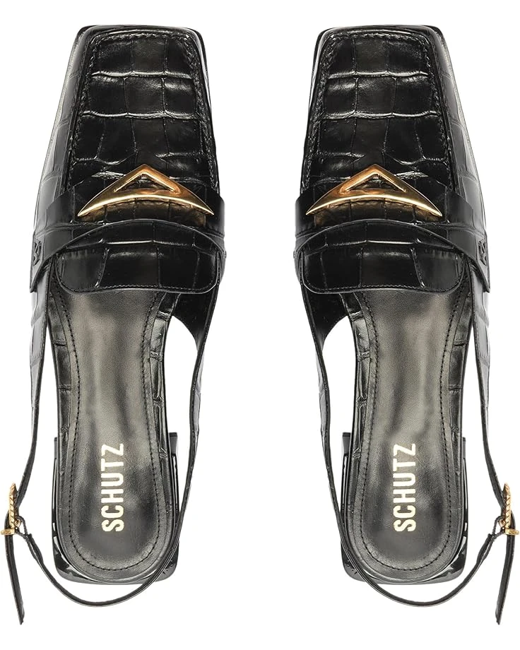 - From casual styles to work outfits, the Schutz® Arizona Sling Block sandals work for different occasions. The EVA insole and synthetic lining of these sandals offer all-day comfort. These heeled sandals are crafted with a croco printed leather upper with an adjustable slingback strap. A perfect choice to style up your outfits, these leather sandals make a great addition to your footwear collection.