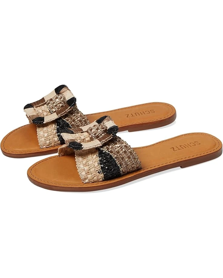 - Styled with a synthetic straw upper with a buckle accent, the Schutz® Cinna Flat sandals are perfect to pair with different styles and looks. The foam insole and leather lining offer all-day comfort and durability. Whether you’re getting ready for an outing or a date, these leather flats are an ideal footwear choice.
