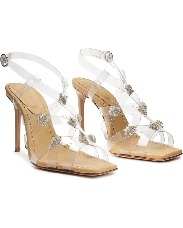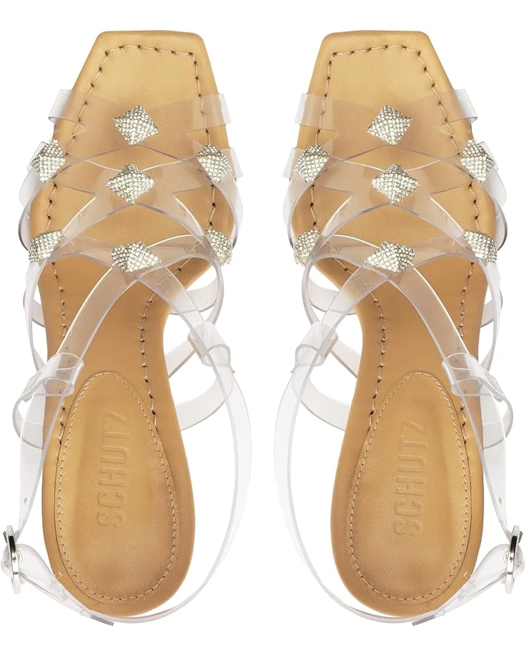 - Carry the sleek, edgy, and sophisticated look for the perfect cocktail party wearing the Schutz® Georgia stiletto heels that features embellished studs detailing on the straps.