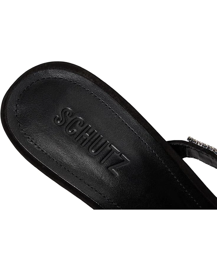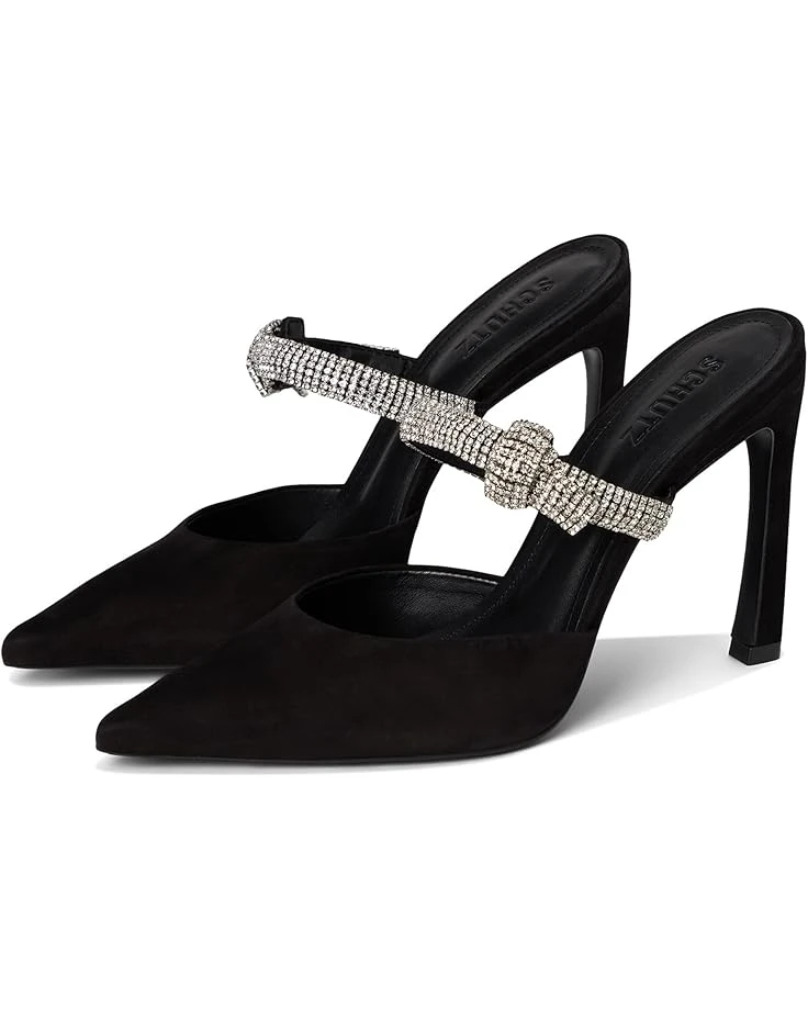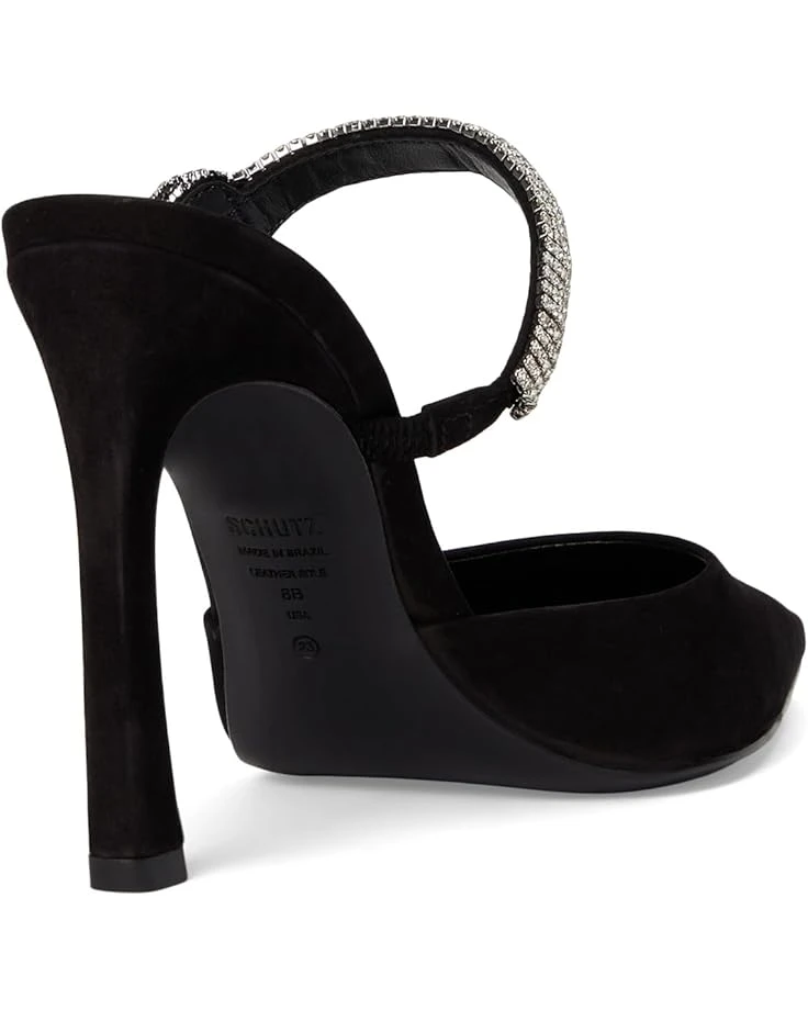 - Add an exquisite touch to your partywear looks wearing Schutz® Pearl Curve Pumps. The pointed toe pumps are crafted with a leather upper, leather lining, and ethylene vinyl acetate insole. The elastic front strap with crystal bow detailing and stiletto heel elevate the style.