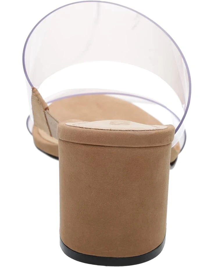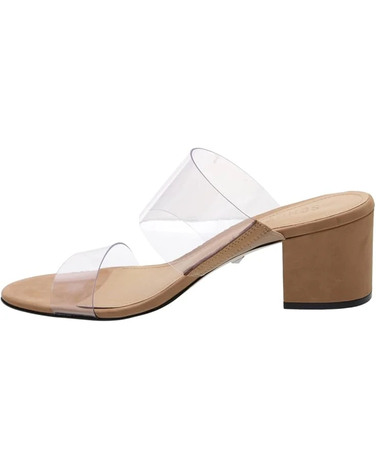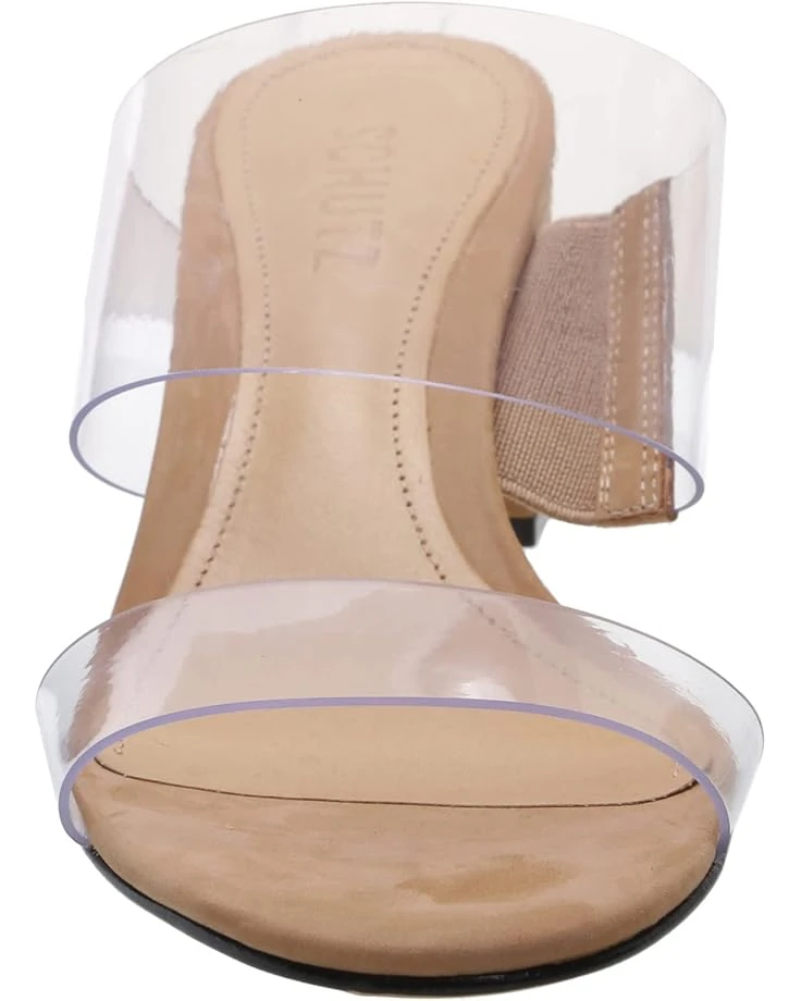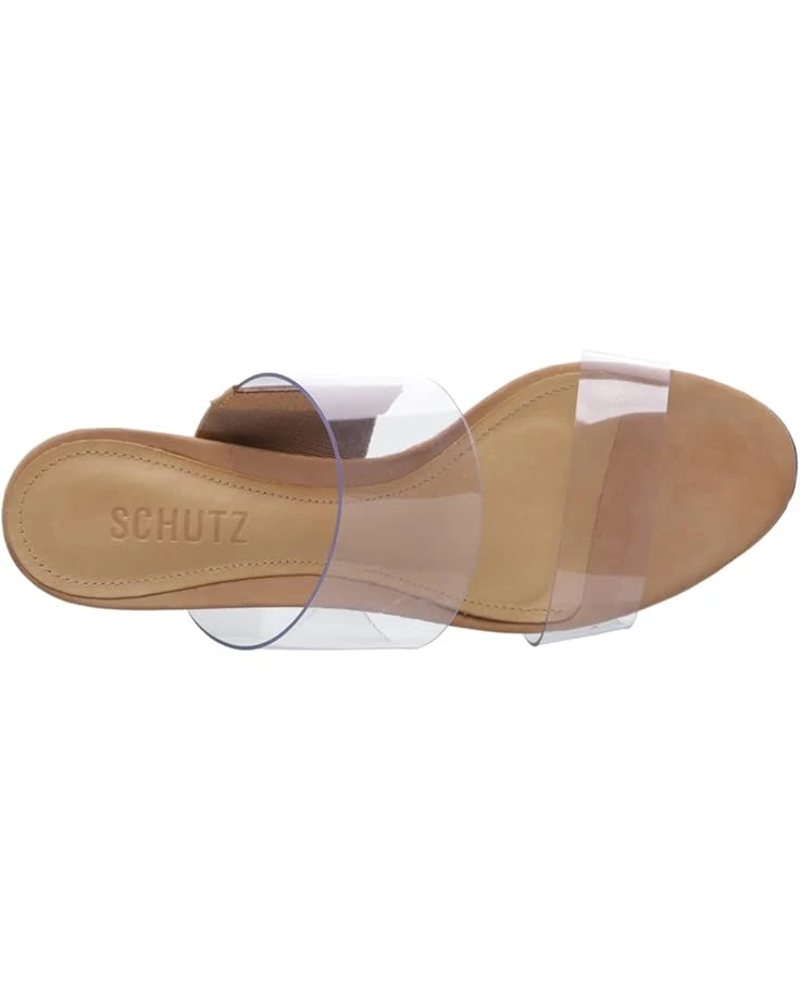 - This season is all about see-through styles and the Schutz® Victorie heeled sandal ticks all the style boxes. This minimal mule sandal showcases clear chunky straps and a block heel that’s easy to walk in. Slip this day to night shoe on with everything from cropped jeans to a midi skirt and jacket. The options are endless.