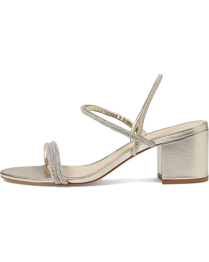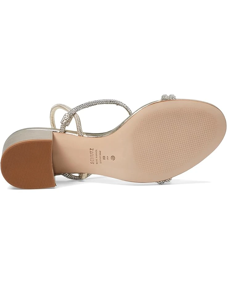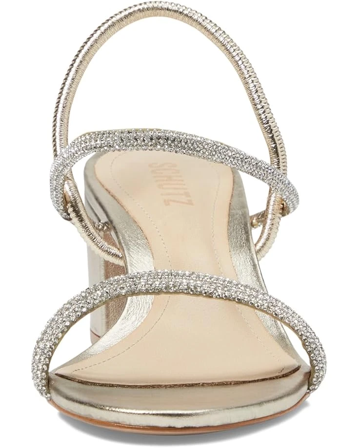- The Schutz® Whiteley Block Sandals are intricately designed using clear rhinestone embellishments on the slim upper straps. This slip-on pair features mid-block heels, a backstrap closure, and an open round toe silhouette.